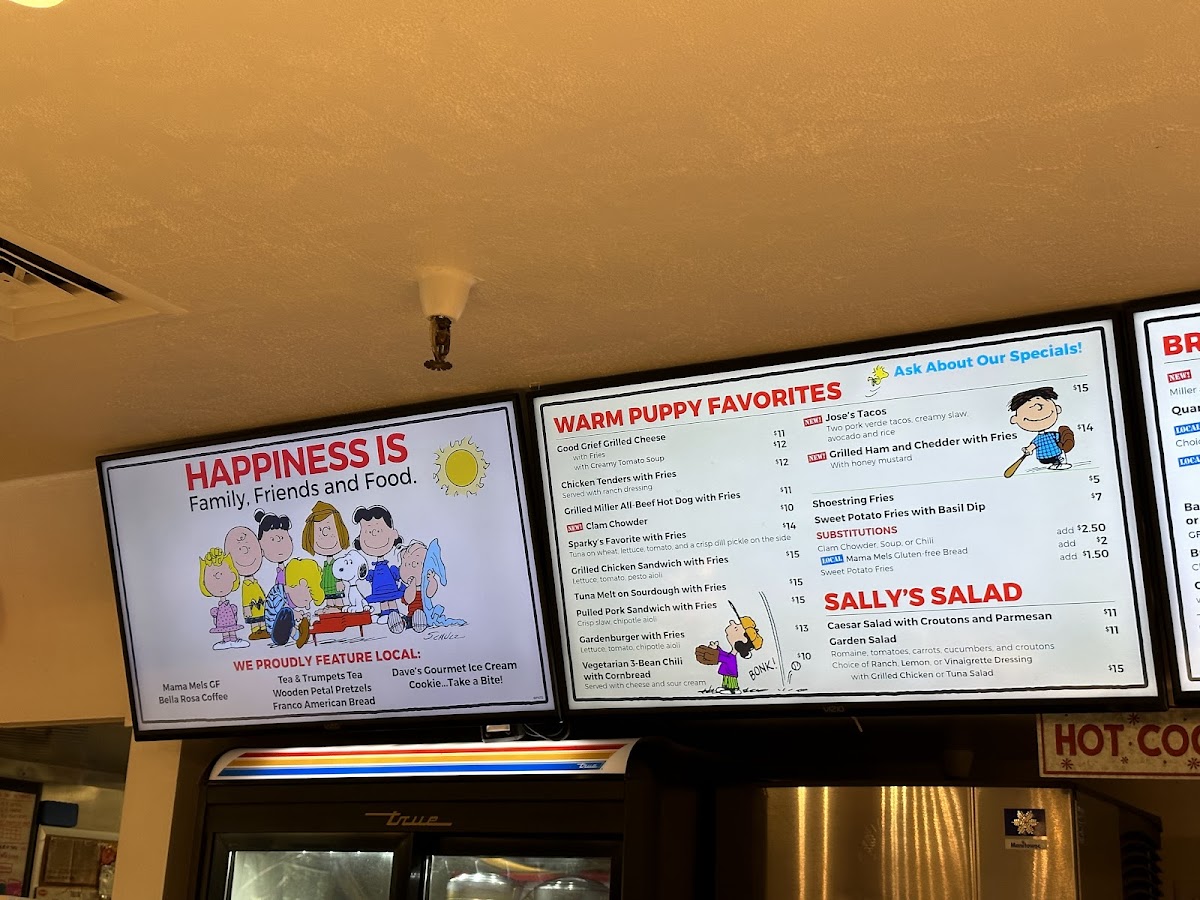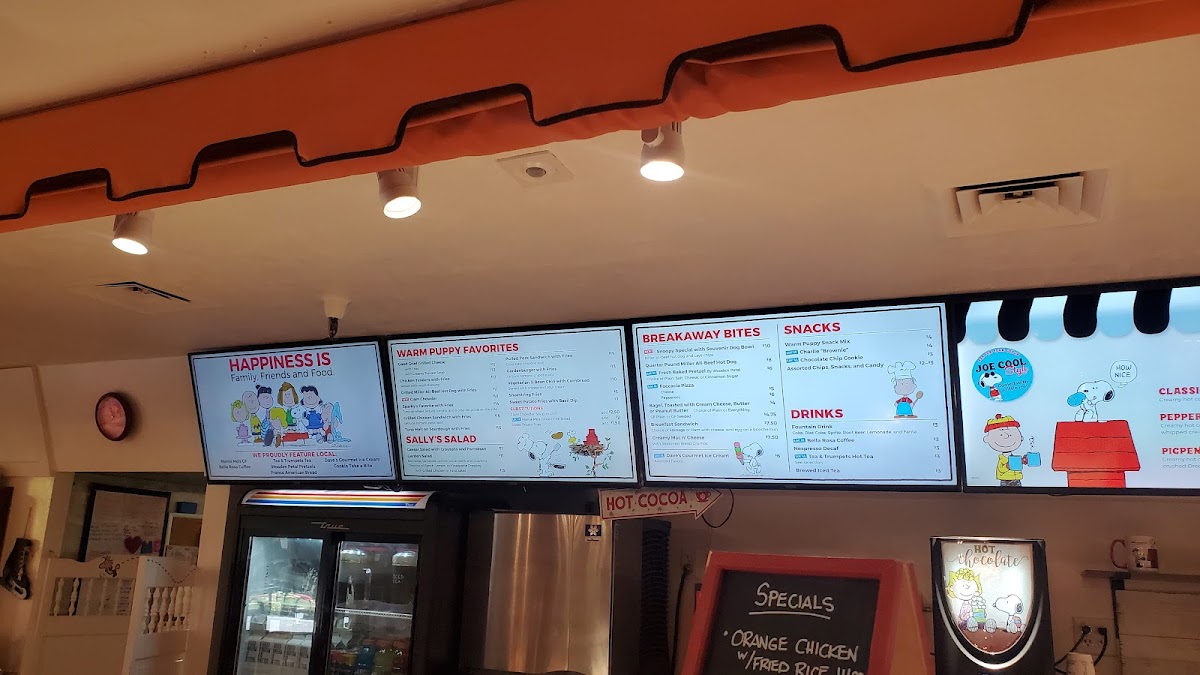 The Puppy Bites section includes smaller snack items such as a fruit cup, churro with sugar and cinnamon, a peanut character-based treat called "Krispy Pop," and sandwiches like almond butter and grape jelly on whole wheat bread. These items are appropriate for casual snacking or light bites throughout the day.